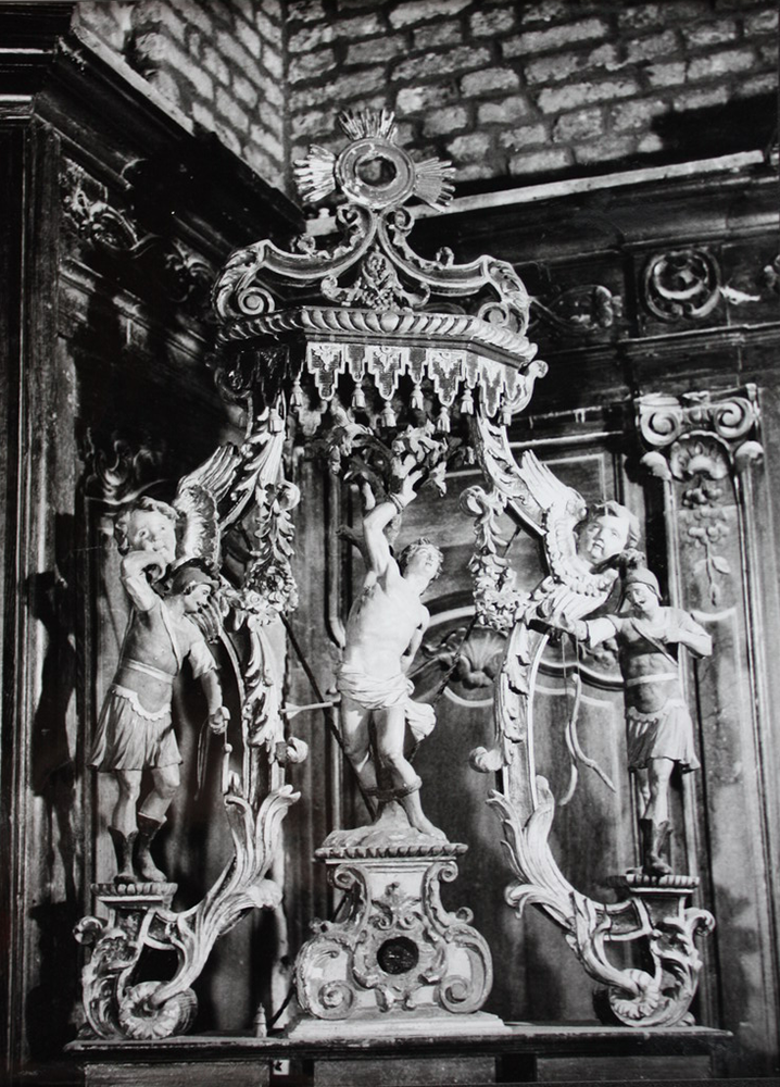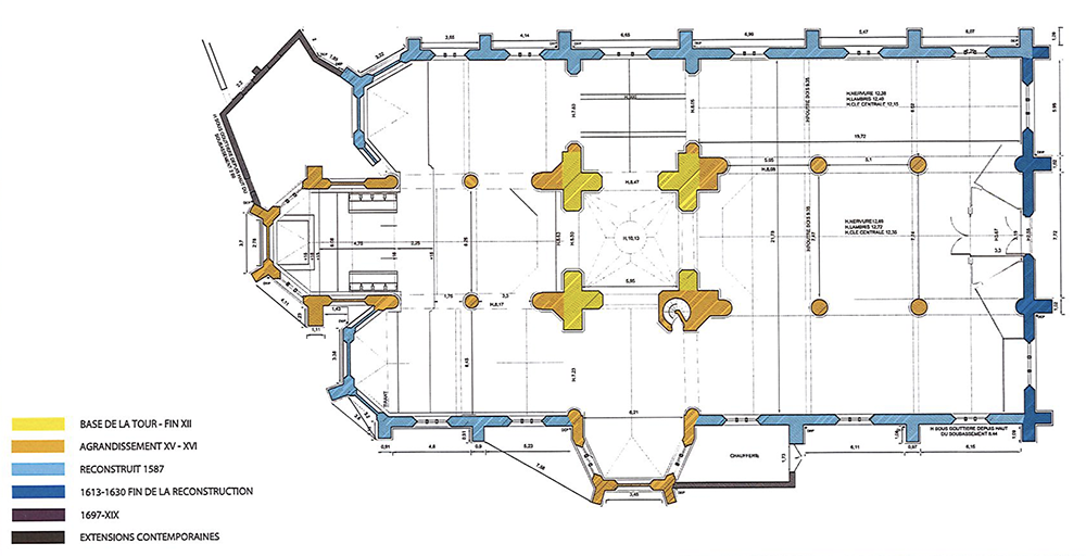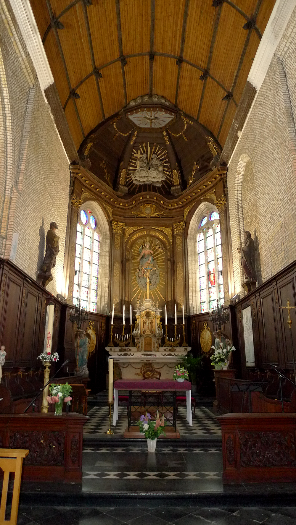 La fenêtre axiale de cette chapelle est aveugle. A l’Est, on observe les trois absides et une sacristie placée derrière l’abside Sud. L’abside de la nef centrale est plus longue que les autres d’une travée droite, son chevet est à trois pans, la baie est aveugle. Chacune des baies des absides latérales, également à trois pans, est aveugle. Les nefs sont séparées, par des colonnes à bases cylindrique et chapiteaux octogonaux sans décor. Elles supportent de larges arcades brisées. A l’origine, la brique de sable était recouverte d’un enduit disparu dans les travaux des années 1959-1962. L’espace sous la tour est couvert d’une voûte d’ogives nervurées à liernes et tiercerons avec un trou central pour les cordes dès cloches. La retombée se fait sur des culots représentant le Tétramorphe. Aujourd’hui, seul le taureau de Luc est encore reconnaissable. Le reste du couvrement de l’église est en berceau lambrissé et compartimenté par des nervures avec entraits. Les sablières portent des blochets à tête d’angelots. Le pavement de l’églisè: est assez varié: dans le chœur, il s’agit de dalles en marbre noir et blanc; dans la chapelle de la Sainte Vierge, ce sont des losanges de marbres de différentes couleurs, dans le reste de l’église, un mélange non homogène de dalles noires et blanches recouvre entièrement le sol.