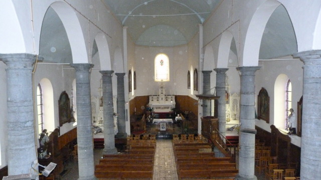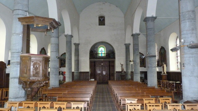L’église Saint-Martin présente le plan classique des sanctuaires construits dans la région à la fin de l’Ancien Régime : précédée d’une tour clocher de plan carré, la nef de quatre travées est flanquée de collatéraux séparés par deux files de colonnes toscanes en pierre bleue, supportant de grandes arcades. Les voûtes sont faites d’une structure de bois dissimulée par du plâtre, et celles des collatéraux sont profilées en quart de cercle. L’ensemble, de plan rectangulaire, est couvert d’un ample comble à pentes latérales, et doté dans l’axe d’un chœur un peu moins élevé, terminé par une abside à trois pans.